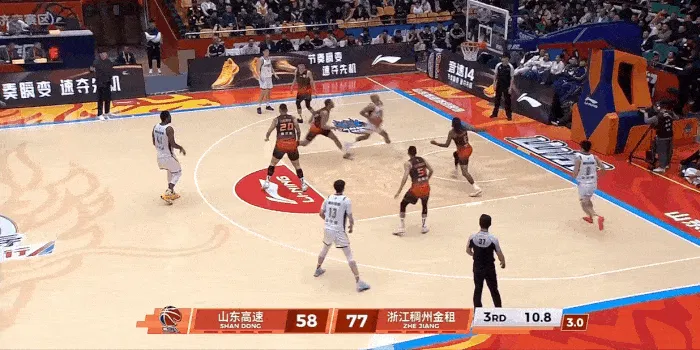 第三节比赛中,安德鲁斯带球上篮轻松得分,浙江三节领先山东21分。