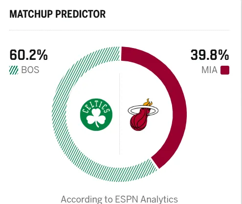 赛前,美媒ESPN预测本场比赛,凯尔特人胜率60.2%,热火胜率39.8%。