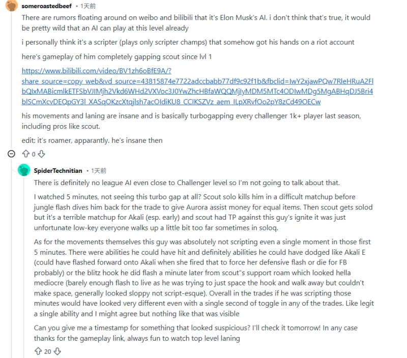 至于走位本身,这人在前5分钟里绝对没有一分一秒是在开脚本的。有些技能他本该中的,有些技能他也绝对能躲掉,比如阿卡丽的E(他本可以在阿卡丽放E时向前闪现贴脸,逼出她的防御性闪现,或者直接拿一血),或者一分钟后Scout辅助游走时机器人的钩子,他交的那个闪现看起来很平庸(勉强闪现活下来,他本来想靠走位扭掉钩子直接走,但没拉开距离,总体看起来很糙,不像脚本)。总的来说,在换血过程中,如果他开了脚本,那几分钟看起来会完全不同,哪怕只开了一秒钟。真的,只要有一个技能不对劲我可能都会同意,但根本看不出来。