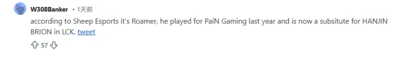 根据Sheep Esports的消息,这人是Roamer。他去年在PaiN Gaming打比赛,现在是LCK赛区HANJIN BRION的替补。